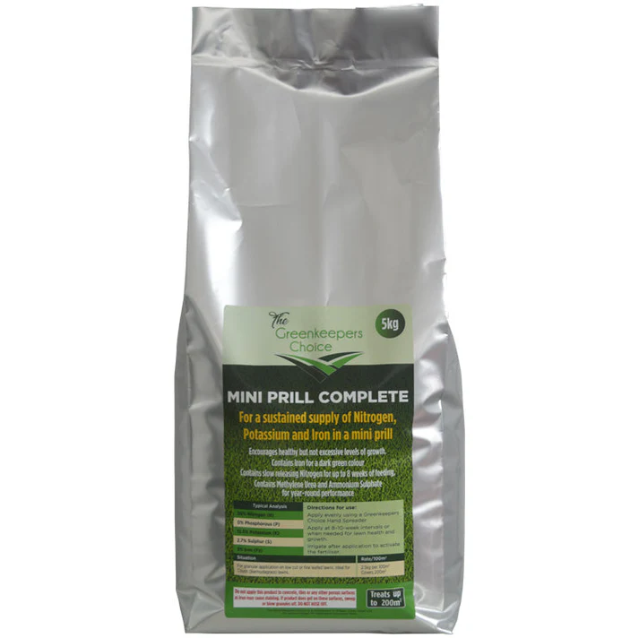 The Greenkeepers Choice Mini Prill Complete for a sustained supply of nitrogen, potassium and iron in a mini prill. Apply at a rate of 2.5kg per 100m2.